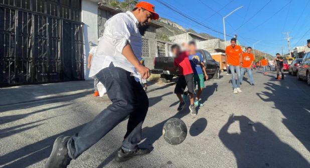 Santa Catarina, NL.- Tras jugar una "cascarita" durante un recorrido en la Colonia Lomas del Mirador, el candidato de Movimiento Ciudadano a la alcaldía de Santa Catarina, Jesús Nava Rivera, dio a conocer que construirá 50 nuevos parques para fomentar la convivencia en la comunidad.