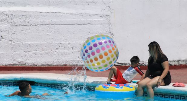Niños, parejas de adolescentes y familias enteras se agruparon en las albercas poco profundas, para practicar sus habilidades en el nado, jugar con pelotas ligeras de plástico o tomar el sol sobre los camastros, a un costado del agua.