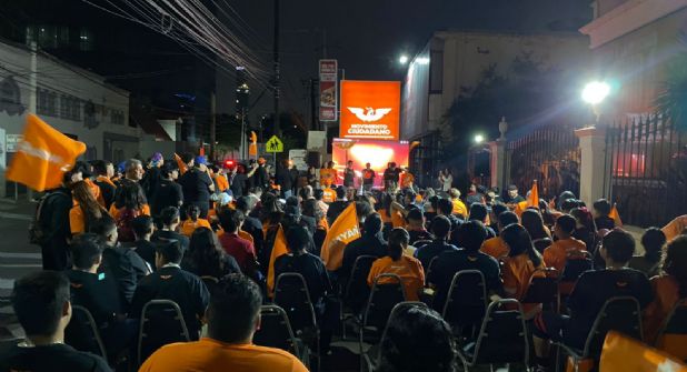 Monterrey.- Simpatizantes de Movimiento Ciudadano se reunieron en la casa ciudadana para apoyar y ver Jorge Álvarez Máynez en el debate a la presidencia.
