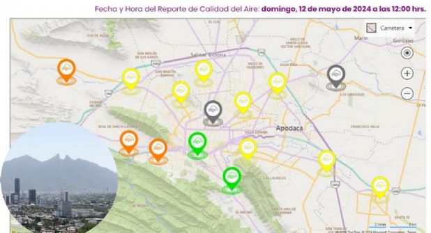 En el reporte de las 12:00 horas, ocho estaciones de monitoreo ambiental registran una calidad del aire “aceptable” (amarillo), además de dos estaciones del municipio de Monterrey que registran “buena” (verde).