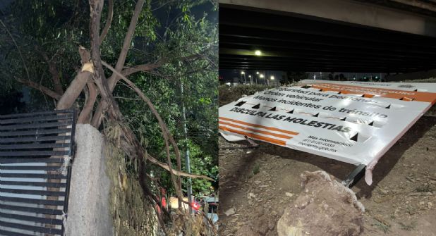 En distintos puntos de Monterrey se presentaron daños en árboles, panorámicos, lonas publicitarias, bardas de edificios y tambos de basura.