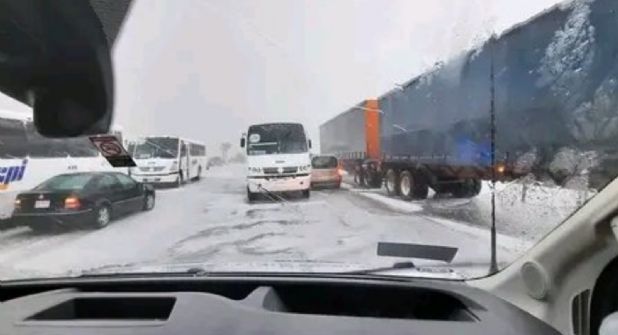 Ante la intensidad de la granizada los automovilistas y choferes de vehículos pesados detuvieron su marcha para evitar ocasionar un accidente vial.