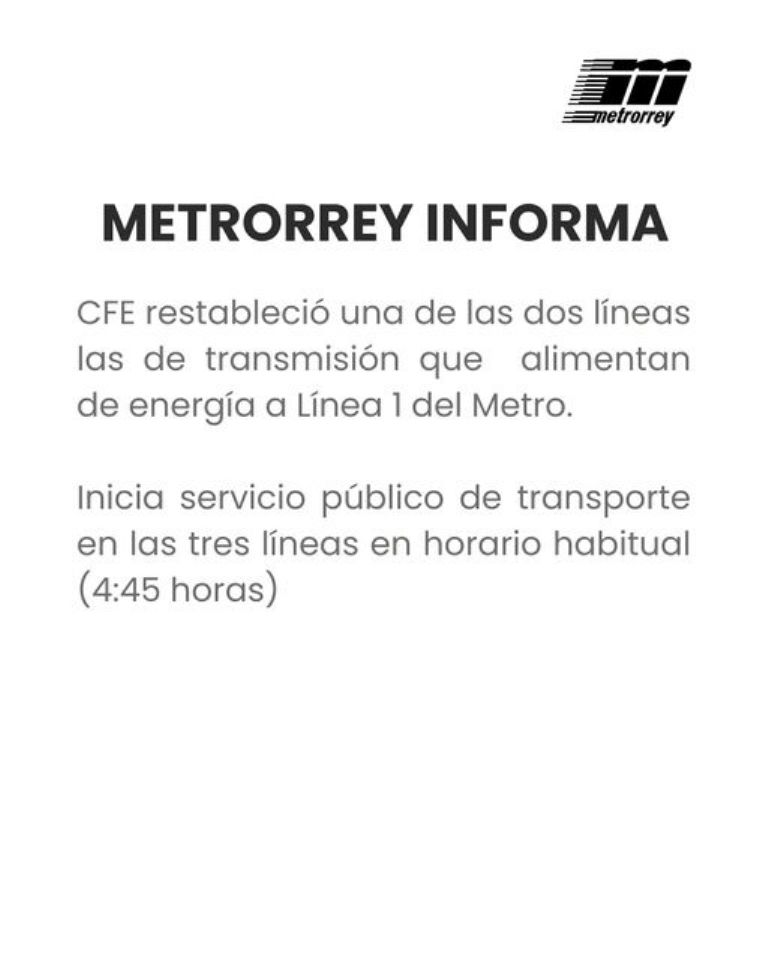 También precisó que la “Línea 2 y 3 del Metro operaban de forma normal, con línea de transmisión de respaldo que alimenta de energía”, se lee en el comunicado de Metrorrey.