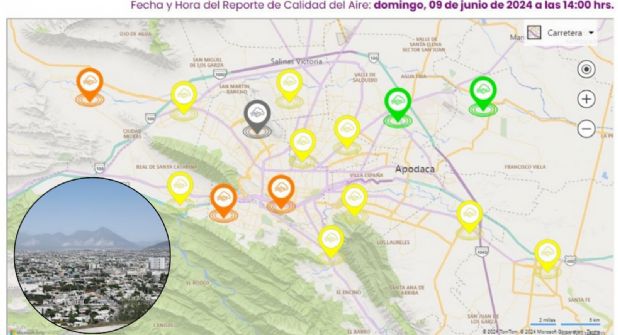 En el reporte de las 14:00 horas, nueve estaciones de monitoreo ambiental registran una calidad del aire “aceptable” (amarillo), además de dos que registran “buena” calidad (verde), las de los municipios de Apodaca y Pesquería.