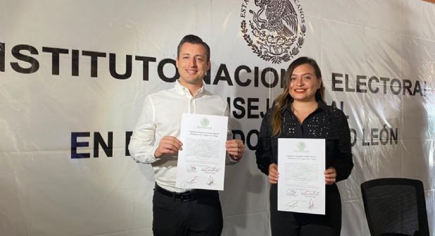 “Del reglamento de elecciones del Instituto Nacional Electoral, expide a la fórmula integrada por el ciudadano Luis Donaldo Colosio Riojas como propietario y la ciudadana, Tabita Ortiz Hernández, como suplente, la presente constancia de asignación como senadores electos en la ciudad de Monterrey a los 9 días de junio del 2024, les pido a los mencionados pasar por su constancia”, mencionó Olga.