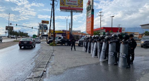 García.- Con 20 patrullas, más de 50 elementos de Fuerza Civil acudieron a evitar un nuevo bloqueo por falta de agua potable en la avenida Heberto Castillo, en el municipio de García, Nuevo León.