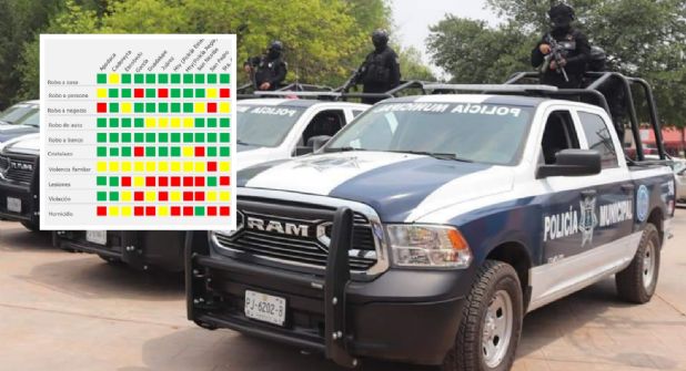 Los delitos que fueron marcados con color verde son siete y estos son robo a persona; robo a negocio; robo de auto; robo a banco; cristalazo; lesiones y el de violación. En tanto, los delitos que aparecen en amarillo son tres y estos son robo a casa, violencia familiar y homicidio.