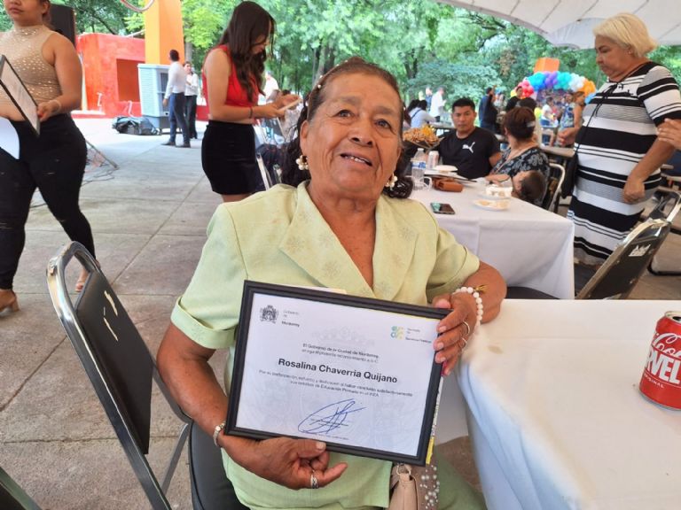 Monterrey.- Doña Rosalinda Chavarría, entre elogios y cumplidos entre sus compañeros al verla sin su uniforme de limpia señaló orgullosa que siempre había querido estudiar, pero que debido a que desde muy joven tuvo que ser cabeza de familia se tuvo que concentrar en el trabajo.