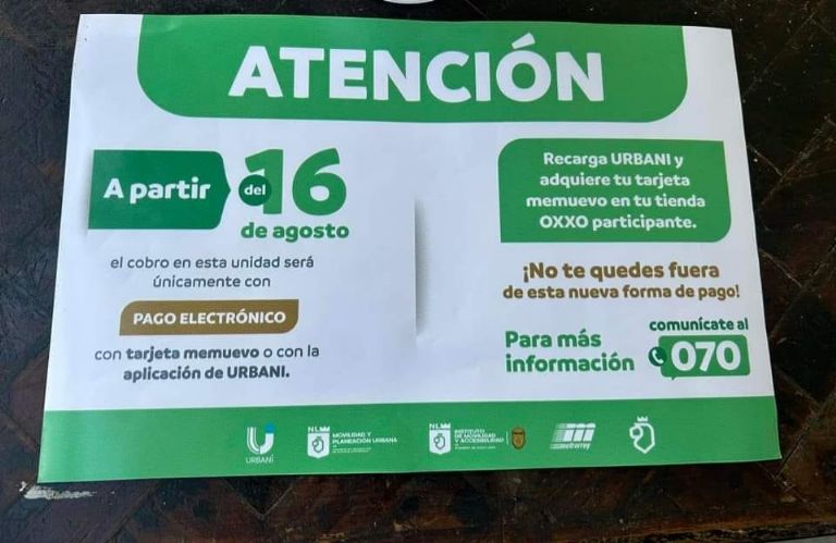 Mediante una imagen que ha circulado en redes sociales, se da conocer que el pago únicamente será mediante la tarjeta memuevo o con la aplicación de Urbani.