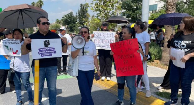 Monterrey. - Bajo el sol y con un intenso calor de 30 grados, empleados del Poder Judicial de la Federación en Nuevo León, se manifestaron a las afueras de Pabellón Ciudadano, ante la aprobación de la reforma judicial en la Comisión de Puntos Constitucionales de la Cámara de Diputados, el pasado 26 de agosto.