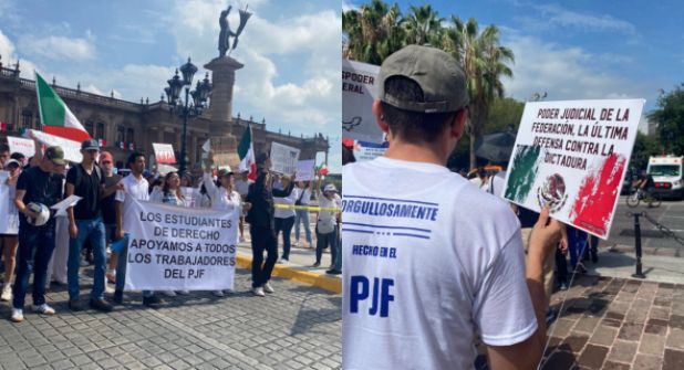 Monterrey.- Estudiantes y miembros de la sociedad civil se unieron a los trabajadores del Poder Judicial de la Federación del Cuarto Circuito este domingo para protestar contra la reforma al Poder Judicial que plantea que los jueces federales y magistrados sean elegidos mediante voto popular.