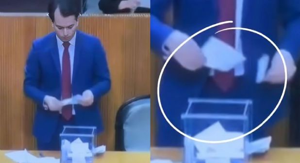 En un segundo video vemos cómo el oficial mayor, estando en el conteo de votos, obtiene dos hojas de votación dobladas juntas. “Para nosotros, es prueba ineludible de que el proceso de votación estuvo viciado, fraudulento, y que va en contra de la honorabilidad de este Congreso”, expuso la emecista Sandra Pámanes.