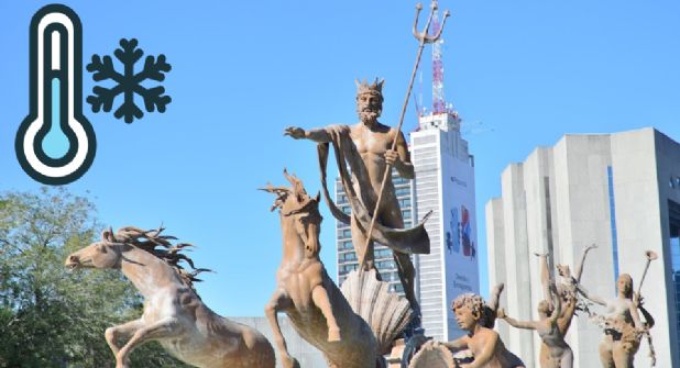 Monterrey. – El clima frío que ha azotado a Monterrey en las últimas horas provocó que este miércoles la Fuente de Neptuno amaneciera cual pista de hielo, es decir, con el agua congelada.