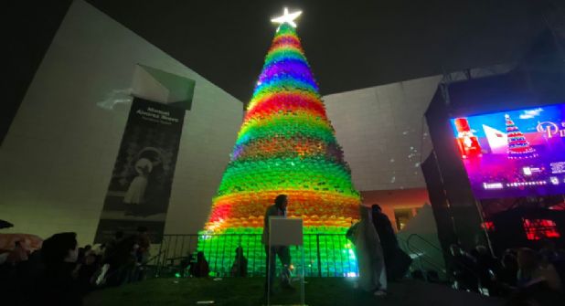 "Para mi este es mi pino número 24 y este año está inspirado en los sarapes mexicanos, en su colorido, en los patrones de las líneas de los sarapes. Lo más importante es que son materiales que usamos el año pasado y aquí estamos reutilizando y reciclando", expresó Rodríguez.