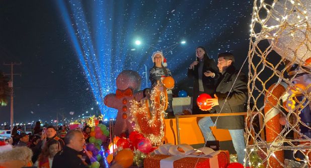 El desfile avanzó entre música, luces y aplausos, generando un ambiente de alegría que se reflejó principalmente en niñas y niños, quienes esperaban con entusiasmo el paso de los carros alegóricos. Samuel García y Mariana Rodríguez recorrieron la avenida saludando a los asistentes y lanzando pelotas tanto a chicos como a grandes, un gesto que provocó sonrisas y momentos de convivencia familiar. También la secretaria Marta Herrera se sumó a la entrega de los artículos y a los saludos, compartiendo el espíritu navideño con los presentes.