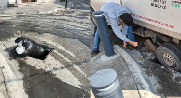 Este miércoles, una camioneta de Correos de México cayó al registro y se estancó de la llanta trasera del lado izquierdo, por lo que tuvieron que usar herramientas para lograr desatorar la unidad y continuar su camino.