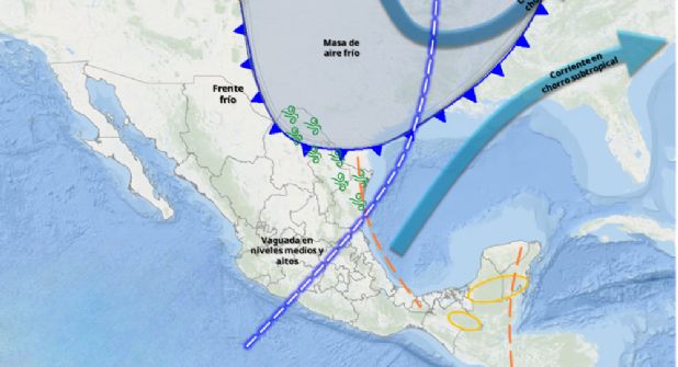 "Un nuevo frente frío se aproximará e ingresará sobre el noreste de México, interaccionará con una vaguada en niveles medios y altos de la atmósfera, ocasionando rachas de viento de 30 a 50 km/h en Coahuila, Nuevo León y Tamaulipas. Asimismo, se mantendrá el ambiente frío a muy frío durante la mañana y noche sobre entidades de la Mesa del Norte y la Mesa Central, con heladas al amanecer en zonas altas", se lee en un comunicado del SMN.