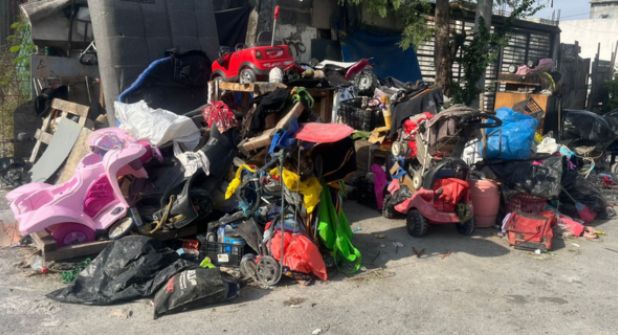 El problema se concentra en la calle Circuito Vista de Jalisco, cerca del cruce con Vista del Arroyo. Ahí, artículos como carritos infantiles, cestos de ropa, canastas, electrodomésticos, entre otros objetos de diverso tamaño, forman una montaña residual que abarca toda la banqueta y parte de la calle.