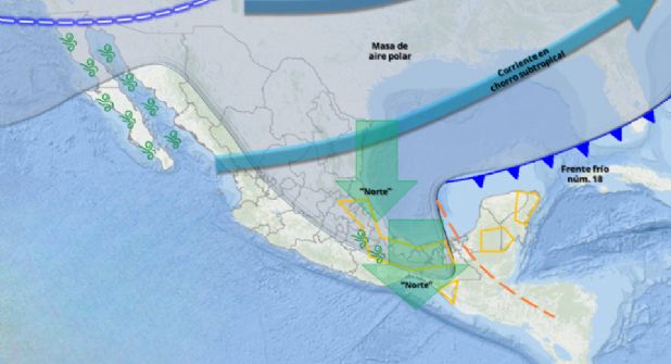"El domingo, el sistema frontal núm. 18 será reforzado por una masa de aire polar proveniente del norte de Estados Unidos y se extenderá sobre el oriente de la República Mexicana, interaccionará con un canal de baja presión que se extenderá sobre el sureste del país, generando descenso de temperatura, chubascos y lluvias fuertes en dichas regiones, pronosticándose lluvias puntuales muy fuertes en zonas de Puebla y Veracruz.