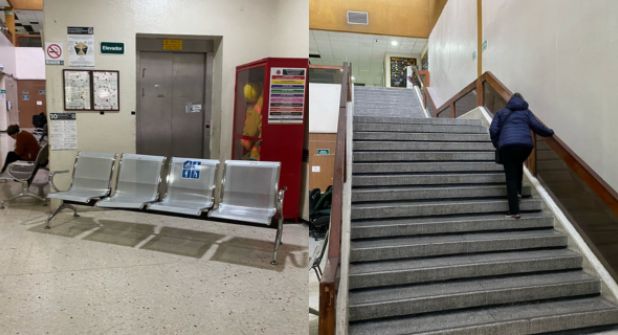 Mientras batallaba para subir las escaleras, otra paciente en compañía de su esposo denunciaron que el problema con este elevador es recurrente, ya que ha presentado fallas en varias ocasiones y no recibe el mantenimiento adecuado.