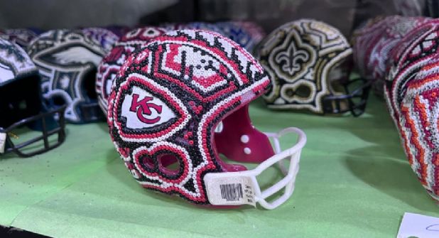 Los amantes de la NFL y de la artesanía pueden encontrar cascos de sus equipos favoritos adornados con arte huichol.
