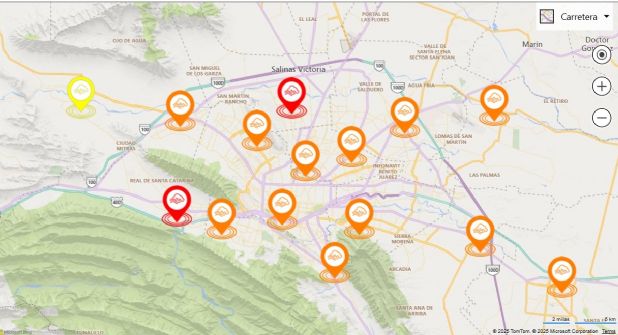 Mientras que, las demás estaciones están en color naranja, es decir, con mala calidad del aire, sólo una se presenta con calidad del aire aceptable y es la ubicada en el municipio de García, en la zona noroeste 2.