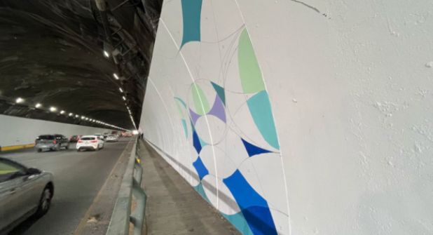 Así se puede apreciar en el sentido San Pedro – Monterrey, donde se observa el boceto de las figuras en tonalidades de azul, verde y hasta morado que conforman el mosaico que será plasmado en los más de 8 mil metros cuadrados que conforman las paredes del túnel.