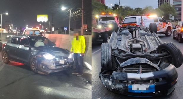 Mientras que en la avenida Aarón Sáenz e Insurgentes en Monterrey, se recibe el reporte de un accidente vehicular tipo volcadura mediante la línea de emergencia de Protección Civil de Monterrey.