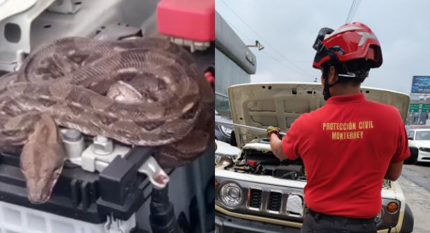 Monterrey.- Un buen susto se llevaron los empleados de una agencia de autos cuando al abrir el cofre de uno de los vehículos se encontraron a una serpiente recostada sobre la batería del automóvil.