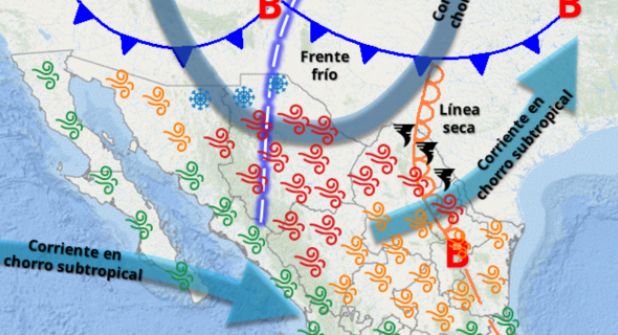 El fenómeno interactuará con una vaguada en altura y una línea seca en el noreste del país, así como con la corriente en chorro polar. Esto generará inestabilidad atmosférica con rachas de viento de hasta 70 km/h en el estado.