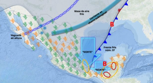 "El domingo, el frente frío núm. 37 se desplazará sobre el oriente del país y el golfo de México, propiciando chubascos y lluvias fuertes en el oriente y sureste mexicano, incluida la península de Yucatán, pronosticándose lluvias muy fuertes a puntuales intensas en Chiapas, Tabasco y Campeche; la masa de aire frío que impulsará el frente, originará descenso de temperatura sobre entidades del norte, noreste, oriente y centro del territorio nacional, así como evento de “Norte” con rachas de viento de 80 a 100 km/h en Tamaulipas y Veracruz; y de 40 a 60 km/h, durante la tarde, en Tabasco.