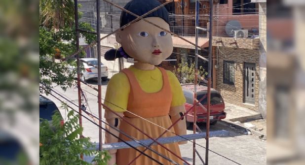 Monterrey.- Una curiosa sorpresa captó la atención de vecinos y transeúntes en la colonia Independencia, en Monterrey, luego de que una ferretería local instalara en la fachada de su negocio una réplica de la famosa muñeca de la serie surcoreana El Juego del Calamar.
