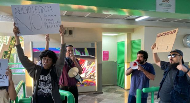 San Nicolás.- Integrantes del "Frente de Organizaciones Ciudadanas por la Defensa del Agua en Nuevo León" realizaron una manifestación pacífica durante la tarde de este miércoles en la estación del Metro Universidad, como muestra de rechazo al incremento en la tarifa del transporte público.