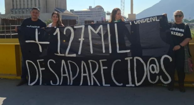 Alrededor de las 08:15 horas de este 10 de mayo, ocho integrantes se dieron cita a este puente peatonal que cruza el Río Santa Catarina para instalar las mantas con las frases: "¿Dónde Están?", "Las Madres No Se Rinden", "Más de 127 mil Desaparecidos" y "10 de mayo nada que celebrar".