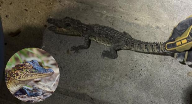 Cadereyta Jiménez. – La aparición de animales salvajes no se detiene en Cadereyta, y este viernes se notificó el rescate de un pequeño caimán al interior de una casa.