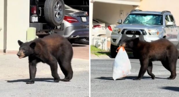 Después de pasar a pocos metros de las casas, el oso cruzó la calle y se acercó a una bolsa de basura, la cual tomó con su hocico y se la trasladó unos cuantos metros para luego dejarla a mitad de la carpeta asfáltica.