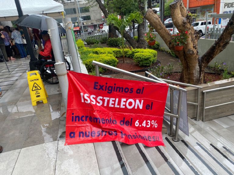 Monterrey.- Con todo y lluvia, los maestros jubilados de la Sección 50 se hicieron presentes en el segundo día del plantón afuera de las instalaciones del Isssteleón.