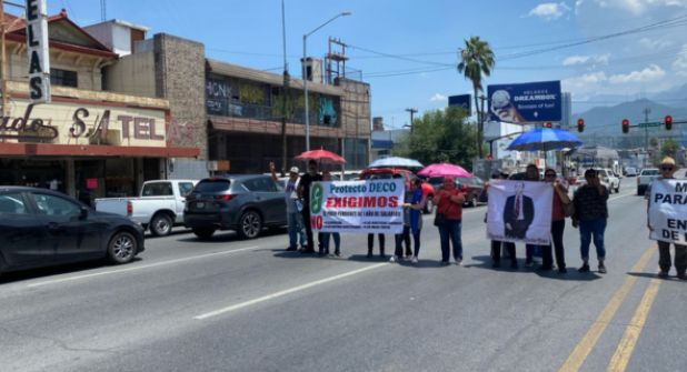 Monterrey.- Al menos 20 exempleados del Grupo Deco del Noreste llevaron a cabo un bloqueo vial la tarde de este miércoles sobre la avenida Pino Suárez, a la altura de Tapia e Isaac Garza, en el centro de Monterrey, como medida de protesta ante lo que señalan como despidos injustificados y la negativa de la empresa para pagar sus liquidaciones.