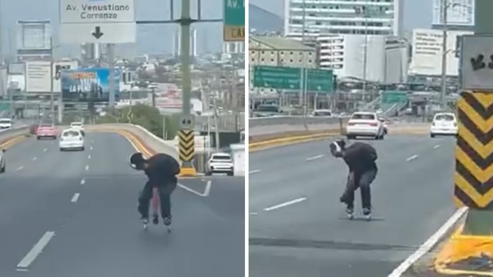 Automovilistas que circulaban de San Pedro a Monterrey, captaron cómo el patinador estaba incluso trasladándose de reversa, con el peligro que eso significaba.