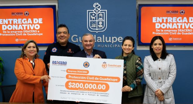 Guadalupe.- La Dirección de Protección Civil de Guadalupe recibió un donativo económico por 200 mil pesos de manos de la empresa DeAcero, el cual se destinará a las labores operativas y administrativas que realiza diariamente la corporación.