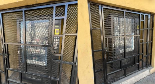 La máquina se encuentra ubicada sobre la vía pública, a unos cinco metros de la entrada de un domicilio, resguardada entre tres paredes y protegida por una doble reja de color negro.