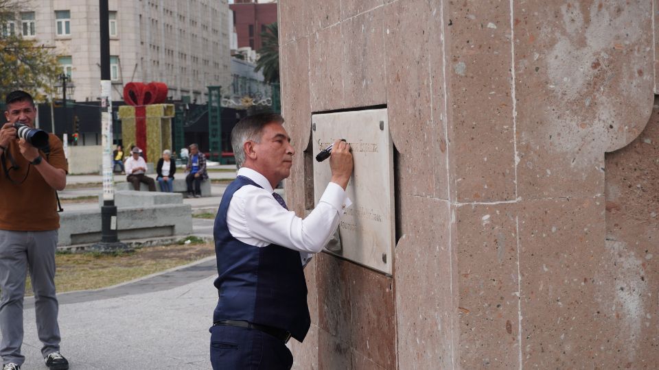 Monterrey.- El exsecretario de Seguridad estatal, Aldo Fasci Zuazua, denunció el deterioro de los espacios públicos de Monterrey y acudió a la Macroplaza para limpiar por cuenta propia el monumento dedicado al militar Juan Zuazua, de quien es tataranieto.