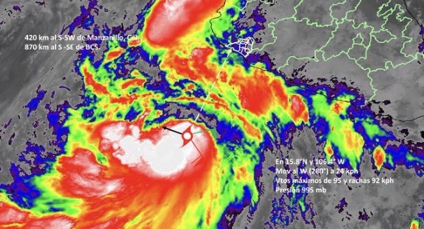 De acuerdo con la Comisión Nacional del Agua, hasta las 10:00 de la mañana, el fenómeno meteorológico se encontraba a 415 kilómetros del suroeste de Punta San Telmo, Michoacán y a 420 km al sur-suroeste de Manzanillo, Colima.