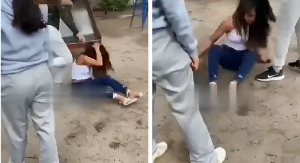 En el video se observa a un grupo de estudiantes golpear a una de sus compañeras. En un momento aprovechan que la víctima está en el suelo para patearla y luego la jalan de los cabellos para arrinconarla en un árbol, todo mientras las otras dos jóvenes la siguen amenazando.