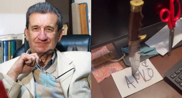 Al mismo tiempo, el padre de Carlos Loret de Mola mostró que en uno de sus escritorios fue dejado un mensaje con las iniciales del jefe del Ejecutivo (AMLO), mismo que quedó incrustado con un cuchillo.