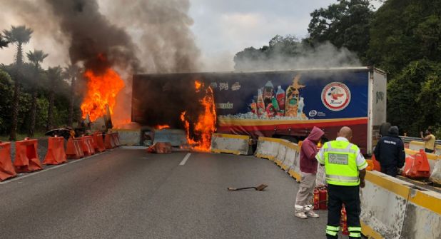 En redes sociales circulan imágenes del tráiler en llamas, así como también del tráfico que generó el accidente.