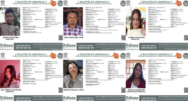 Las personas buscadas son Trinidad Goicochea Salcedo, de 67 años; Norma Esquivel Ortiz, de 36 años; Joel Huicochea Arce, de 33 años; Natalie Guadalupe Huicochea Esquivel, de 23 años; Ana Teresa Huicochea Esquivel, de 19 años; Edwin Huicochea Esquivel, de 14 años; Lucero Huicochea Esquivel, de 13 años; Dilan Tadeo Huicochea Trinidad, de 4 años, y Kelly Natalie Huicochea Trinidad, de un año.
