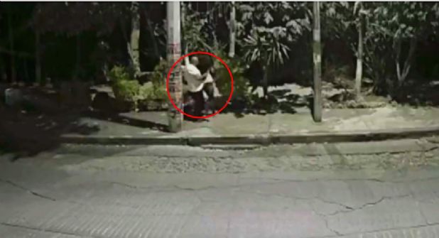 Fue en un video que circula en redes sociales que se aprecia como una combi se estaciona y luego aparece un hombre de playera blanca, pantalón y tenis negros que se esconde en la sombra.