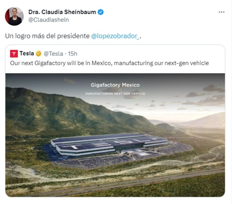 Ciudad de México. – Ayer miércoles Tesla hizo oficial la construcción de una gigaplanta armadora de autos eléctricos en el estado de Nuevo León, y la jefa de Gobierno de la Ciudad de México, Claudia Sheinbaum, aseguró que el presidente Andrés Manuel López Obrador fue responsable directo de esta situación.