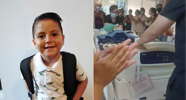 En redes sociales circulan videos donde se observa el momento en que la camilla donde estaba el pequeño pasa entre la larga fila de personas que le aplaudían en los pasillos del nosocomio.